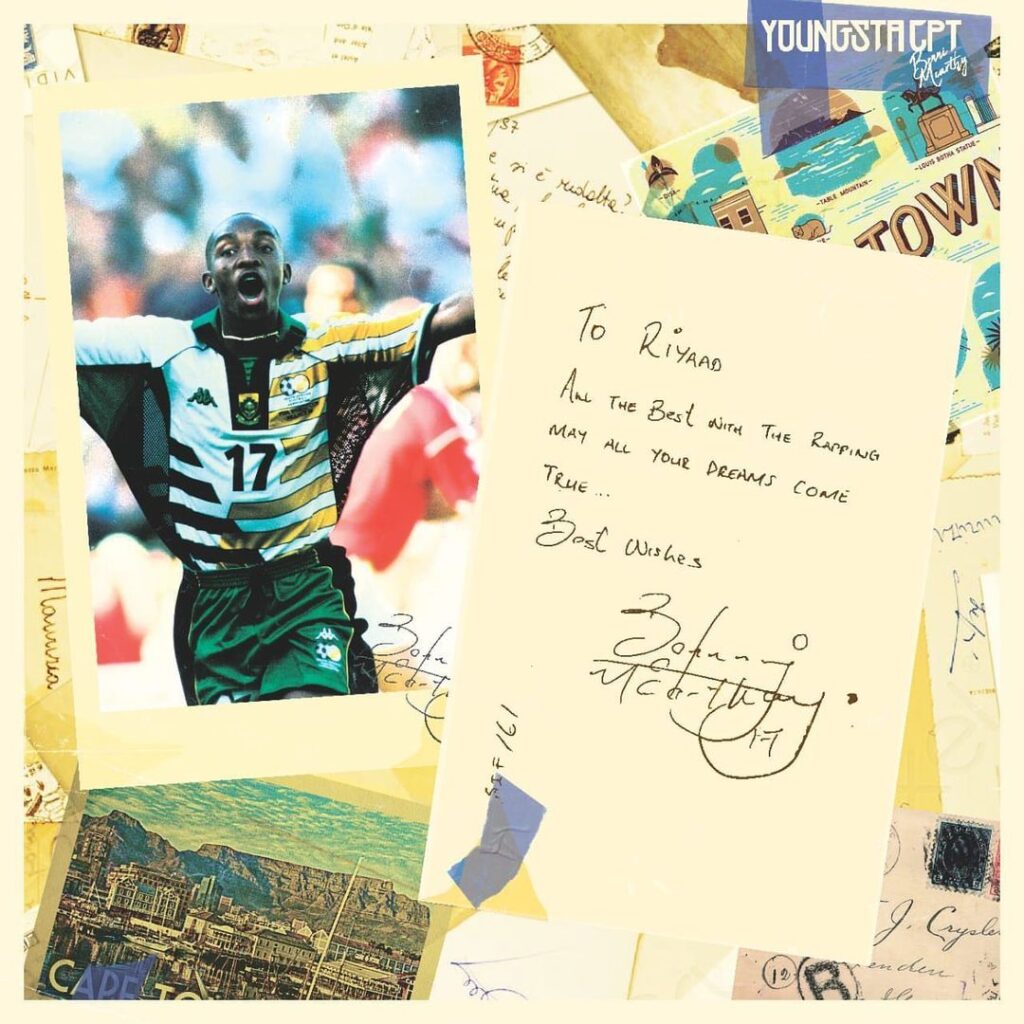 “People say that I was overrated. I was fired from Cape Town City, and that I was gonna fail,” Benni McCarthy says in a 2021 footage while still serving as the head coach of Amazulu FC. This opening to ‘Benni McCarthy’ introduces the theme of the underdog-cum-outcast, the story of YoungstaCPT evolving from the fringes of Kaapse life to being one of Mzansi’s most acclaimed and respected rappers. Rapping in an empty stadium with a beanie on and in the company of young kids, he raps: “I’m repping the city, takin’ it with me wherever I go like Benni McCarthy”.